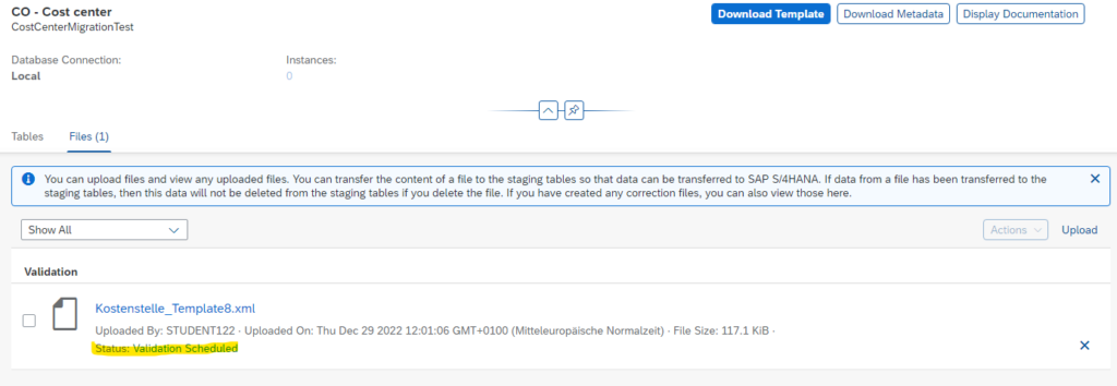 When uploading the completed file to the migration project the file is queued for getting validated. The status can be checked in the monitoring function of the app.